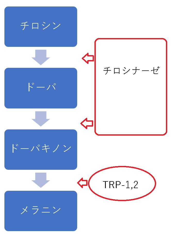 下の図のように、チロシナーゼやTRP-2の働きが抑えられると、チロシンからメラニンが合成されるまでの行程がうまくいかなくなるので、美白効果を期待できます。