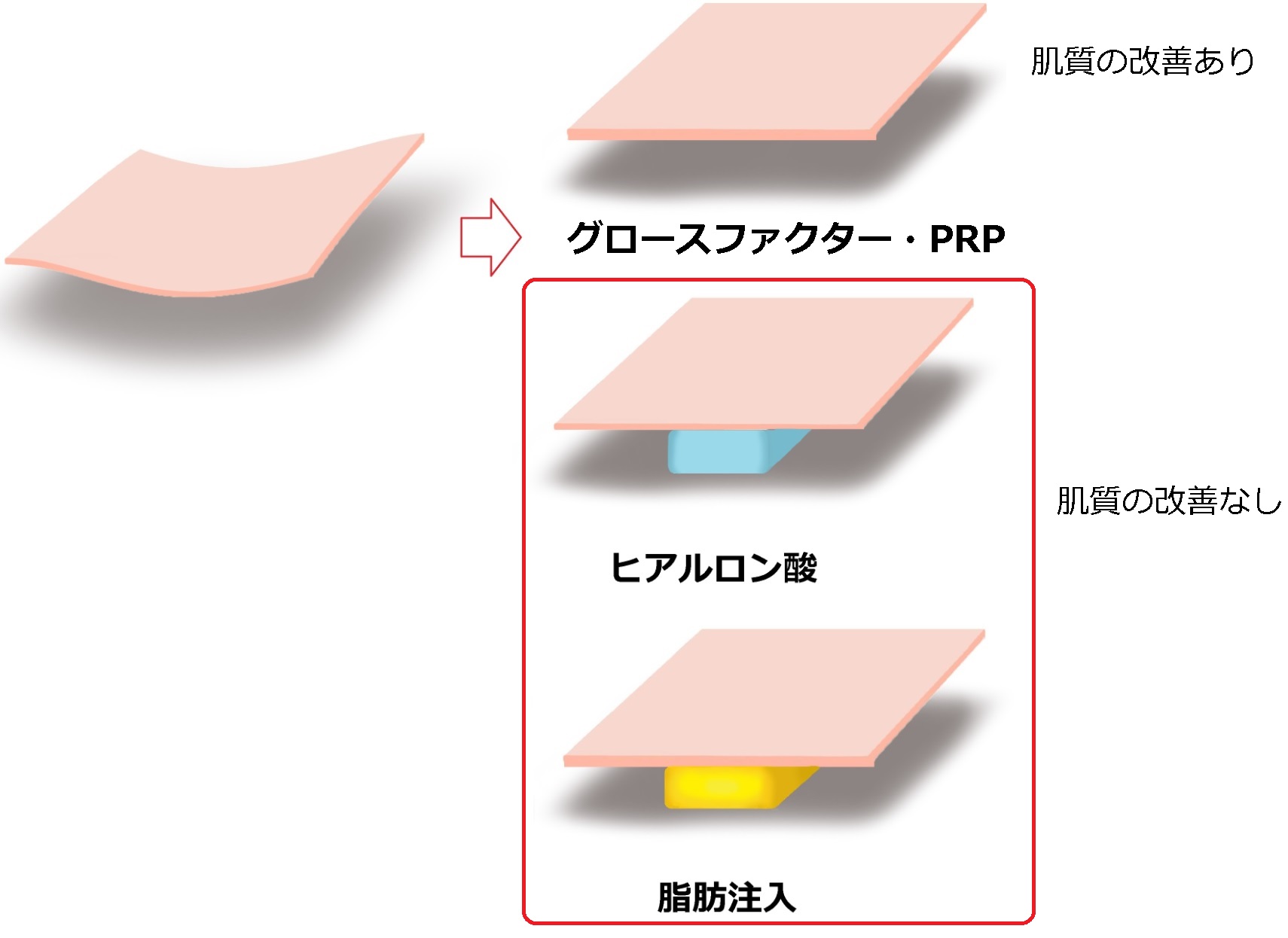 ・肌質の変化の違い・・・グロースファクターは肌質が改善するが、脂肪注入は改善しない。