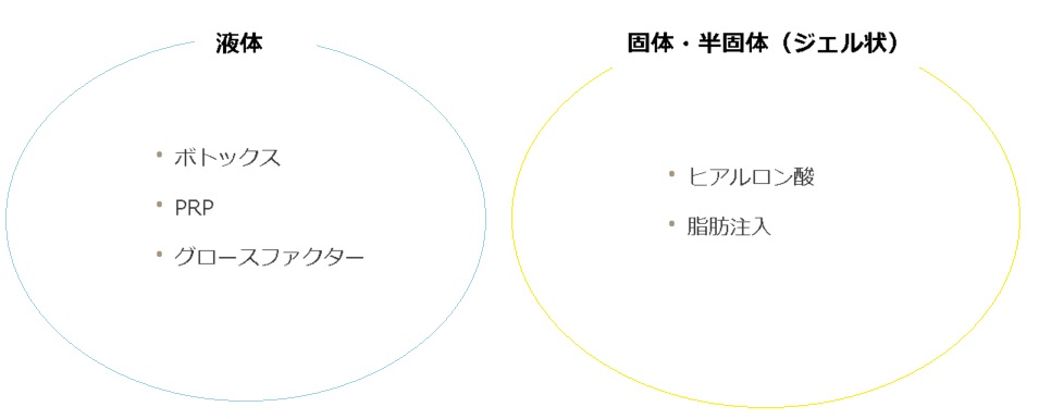 リフトアップ用の注射治療を「液体」か「固体(半固体・ジェル状)」かで分けると、以下の通りになります。