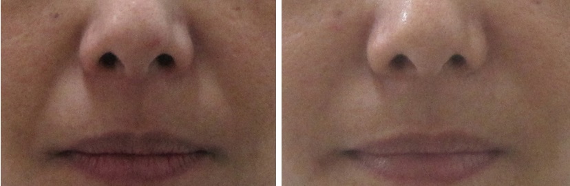 施術前/1年2か月後・・・よく見るとわずかに折れ癖が残っていますが、ほうれい線は十分にリフトアップされています。
