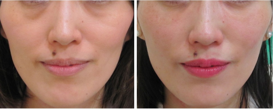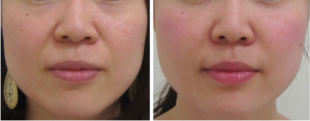 施術前/9か月後・・・笑った状態のほうれい線も浅くなっています。