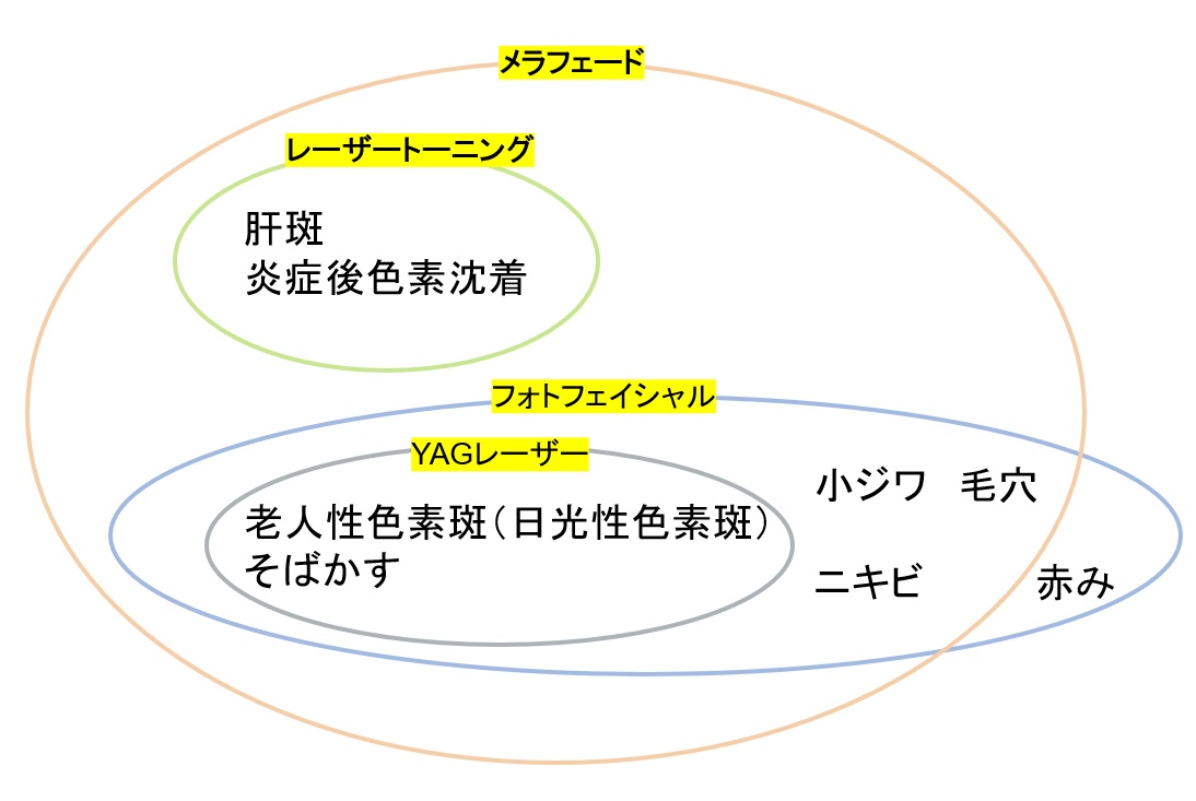 フォトフェイシャルやシミ用のレーザーは、日光によるシミには有効ですが、肝斑には効きません。