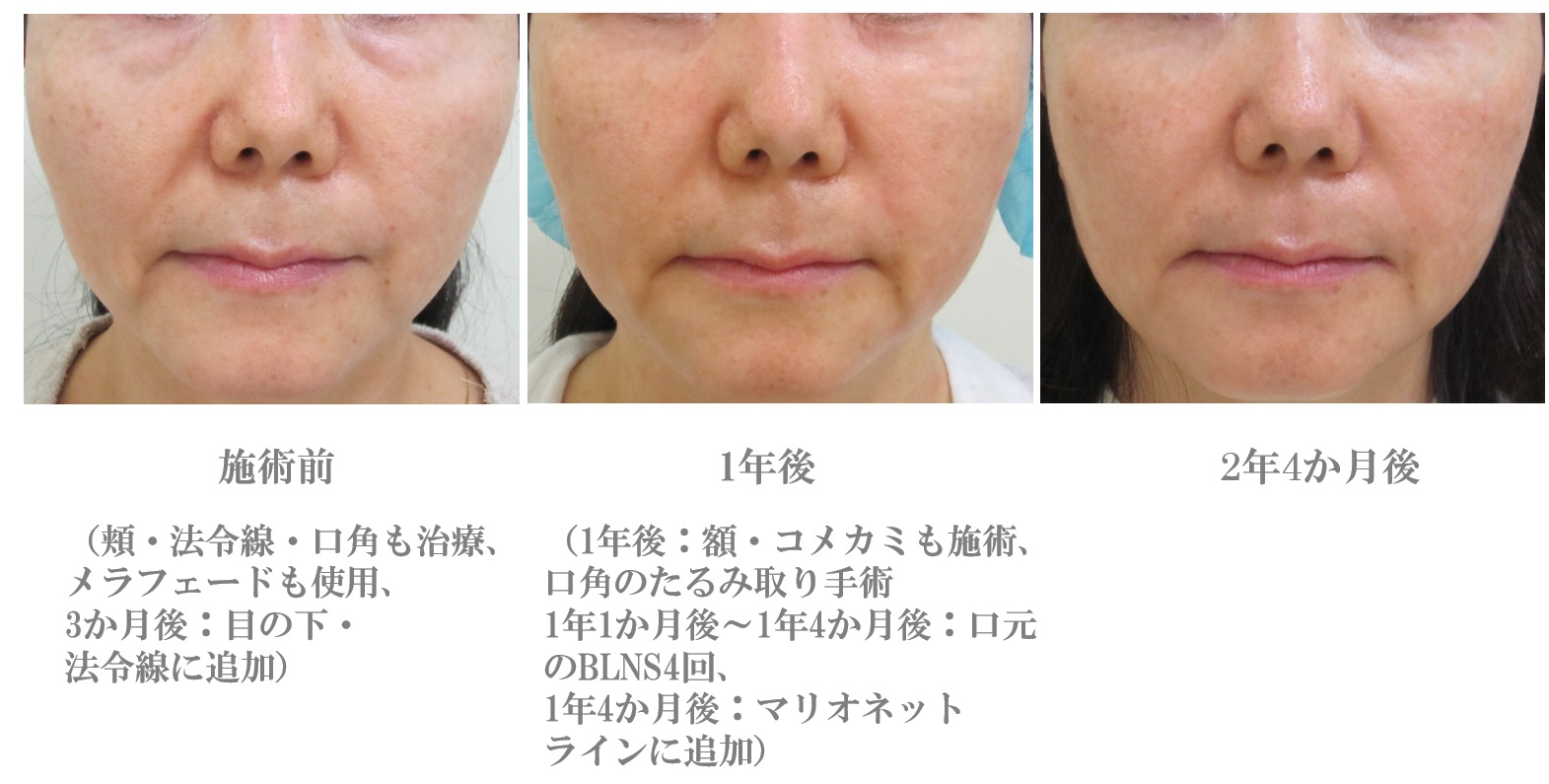 最終的に口元のシミ・くすみが残っていますが、段階的に口元のたるみが改善しています。