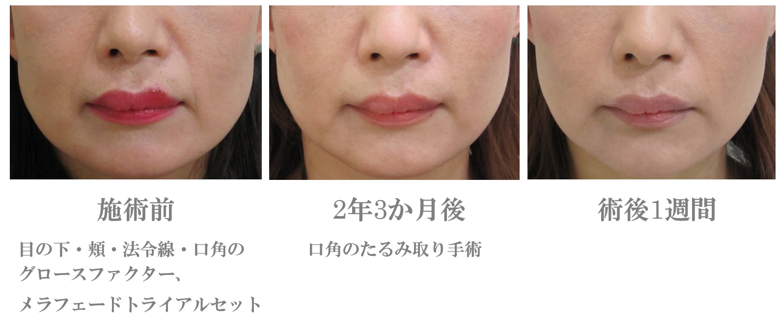 目の下・頬・法令線・口角のグロースファクター、メラフェードトライアルセット、口角のたるみ取り手術による治療を受けられたモニターの方です。