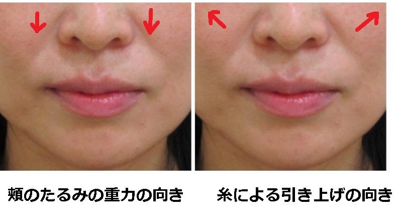 ・糸による引き上げの方向が頬のたるみの重力の向きとずれている。