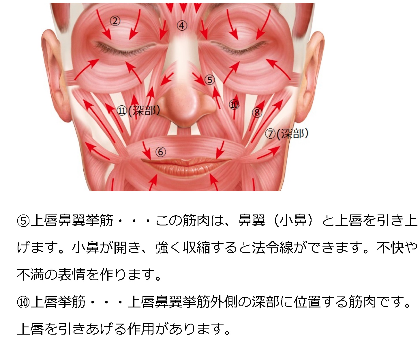 その他、⑤上唇鼻翼挙筋、⑩上唇挙筋もほうれい線上のえくぼに関与します。(詳細は後述)
