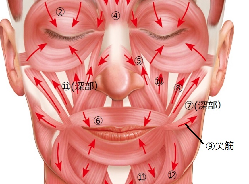 ほうれい線のえくぼに主に関与する筋肉は、⑨の笑筋と呼ばれる筋肉です。