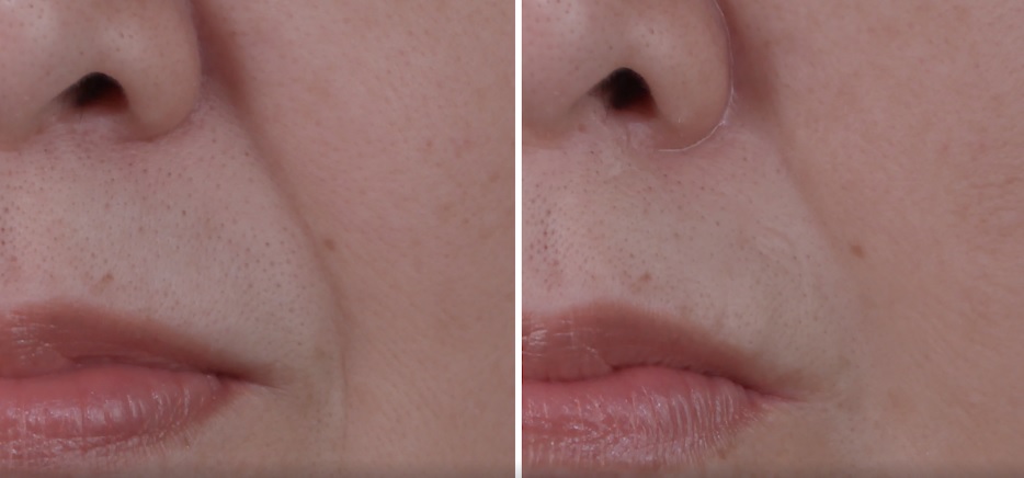 この場合は、ほうれい線上の色と微妙な毛穴の凹凸(光の加減でシワに見える)をカバーすることで、ほうれい線を浅く見せることが可能です。