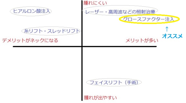 上記各種治療法を、「ネックとなるデメリットの有無」「腫れなどのダウンタイム」の観点から整理すると、以下のようになります。