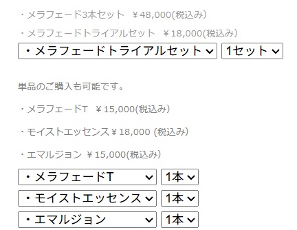 メラフェード発注フォーム こちらは当院のカウンセリング受け、処方を受けられた方のみ購入可能となります。 まだカウンセリングを受けられていない方は、まずこちらからメール相談をお願いします。 なお、トライアルセットにつきましても、こちらのフォームからはご注文いただけるようになりました。 メラフェードのご使用方法は、こちらをご覧下さい。 必須氏名(漢字) (匿名、ニックネーム不可) 必須氏名(よみがな) 必須郵便番号・住所・電話番号 〒 - 必須メールアドレス 必須メールアドレス(確認用) 診察券番号 必須ご希望の品名 ・メラフェード3本セット ¥48,000(税込み) ・メラフェードトライアルセット ¥18,000(税込み) ・メラフェード3本セット ・メラフェードトライアルセット 1セット 2セット 3セット 単品のご購入も可能です。 ・メラフェードT ¥15,000(税込み) ・モイストエッセンス¥18,000 (税込み) ・エマルジョン ¥15,000(税込み) ・メラフェードT ・モイストエッセンス ・エマルジョン 1本 2本 3本 ・メラフェードT ・モイストエッセンス ・エマルジョン 1本 2本 3本 ・メラフェードT ・モイストエッセンス ・エマルジョン 1本 2本 3本 ※送料は別途¥1,000申し受けます。 必須お支払い方法 銀行振込み クレジット/コンビニ支払い ※コンビニ支払いは、ファミリーマート/ローソン/セイコーマート/ミニストップのみとなります。(セブンイレブンは不可)。 必須お届け希望日 指定なし 指定する 「指定する」を選択された方は、お届け希望日を指定して下さい。なお、決済完了までに1~2診療日程度(木・日休診)、さらに集荷・配送に1~3日(決済完了のお時間帯や配送先のご住所により変わってまいります)かかりますことをご了承下さい。 必須お届け希望時間 指定なし 午前中 14~16時 16~18時 18~20時 19時~21時 ・お振込みについて 本フォーム送信後、数日以内にお振込みの案内メールをお送りいたします。メールをお受け取り後、1週間以内にお振込みいただきますようお願い申し上げます。 ・メラフェードの使用方法などについてご質問がありましたら、お問い合わせよりご質問いただければ幸いです。 ・個人情報の取り扱いについてはプライバシーポリシーをご覧下さい。 ・お日にちの指定について 直近(5日以内)のお日にちをご指定の場合、できるだけ最善を尽くしますが、到着が間に合わない場合がありますので、その場合は、翌日以降のご指定のお時間帯のお届けになりますことをご了承下さい。 ・当院がはじめての方へ 恐れ入りますが、こちらのフォームをお送りになる前に、お問い合わせフォームより現在のお悩み(例:頬の肝斑 など)、お写真などの情報をお送りいただく必要がございます。(その後にご案内をこちらよりご返信いたします。) ・当院受診歴があり、メラフェードの処方が初めての方へ これまでのメールよりメラフェードご希望の旨を「ご返信メール」にてお送りいただければ幸いです。 ・以前のお電話番号が変更になった方へ 住所記載欄に新しい番号をご記載いただければ幸いです。 ・トライアルセットをご希望の方へ 恐れ入りますが、トライアルセットは、初回のみのご購入とさせていただいております。 ご了承のほど宜しくお願いいたします。 ・トライアルセットと通常の3本セットを同時にご注文される場合 例えば、以下のようにお申込みいただければ幸いです。 (単品3つの価格の合計は、3本セットの価格と同じになります。) ・個人情報の取り扱いについてはプライバシーポリシーをご覧下さい。 特定商取引法に基づく表記≫