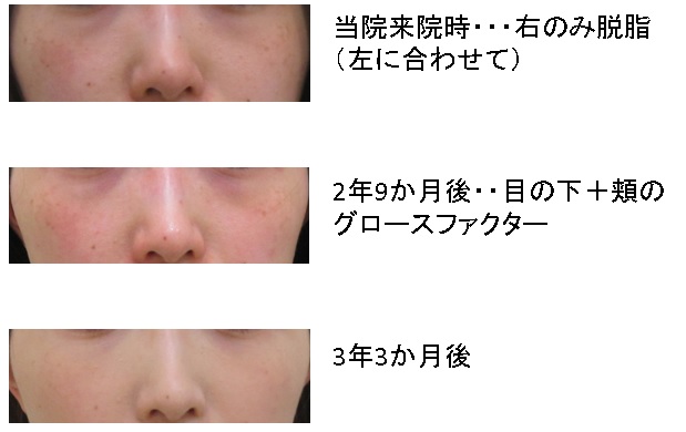 また、こちらの方は、修正治療ではグロースファクターに抵抗を示され、片側の脱脂のみを強く希望された結果、結局グロースファクターによる治療が必要となりました。