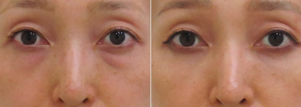 術前/術後4か月・・・目の下の脂肪が飛び出していますが、赤クマが強く、メイクでも隠せないくらい赤みを帯びています。