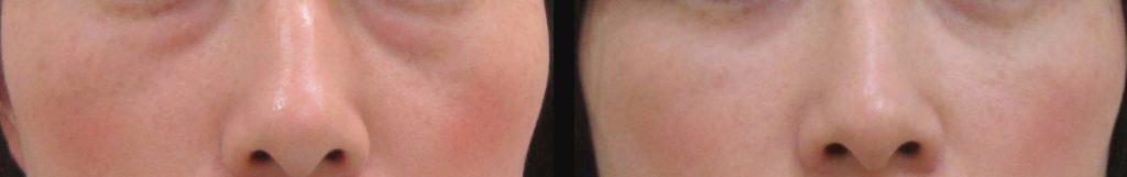 グロースファクターのみですと、眼輪筋への目の下の脂肪の圧迫は変わらないので、完全に赤みは取れるわけではありませんが、皮膚が薄くなることで赤みが透けて見えづらくなり、赤クマはある程度改善します。