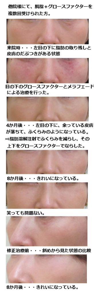 対策としては、皮膚の弾力が低下している方は、「控えめに脱脂+目の下・頬のグロースファクター」を行うという対処法により未然に防ぐことができると考えます。