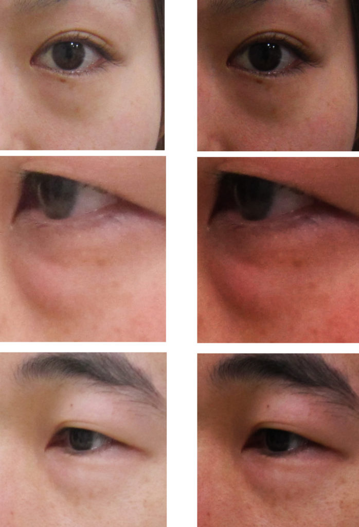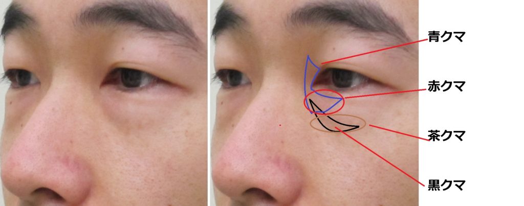 青クマがあると、茶クマと重複し、茶クマがひどく見える原因となります。
