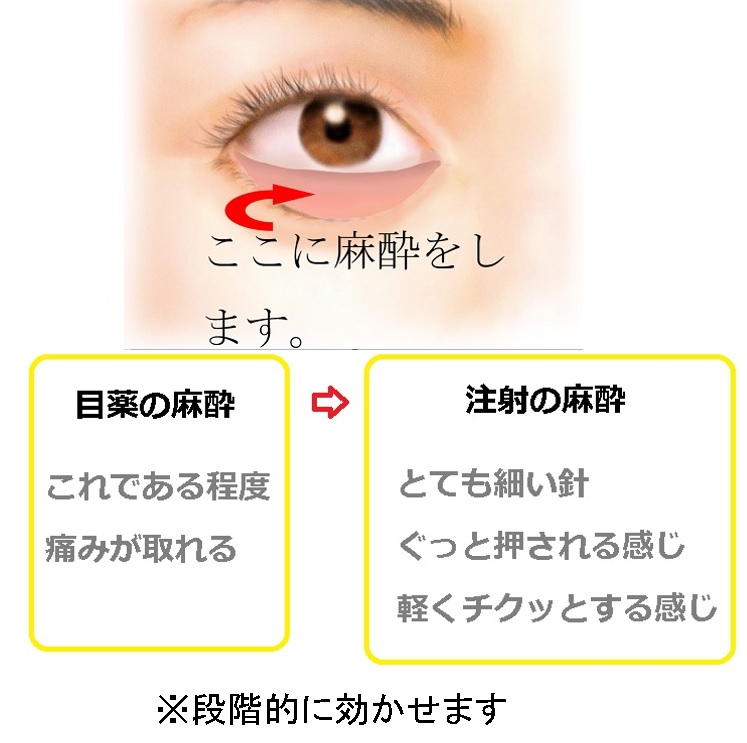 目薬の麻酔である程度痛みを感じなくなっているので、注射は押されている感じくらいでほとんど痛みは感じません。(感じ方には多少個人差があります。)