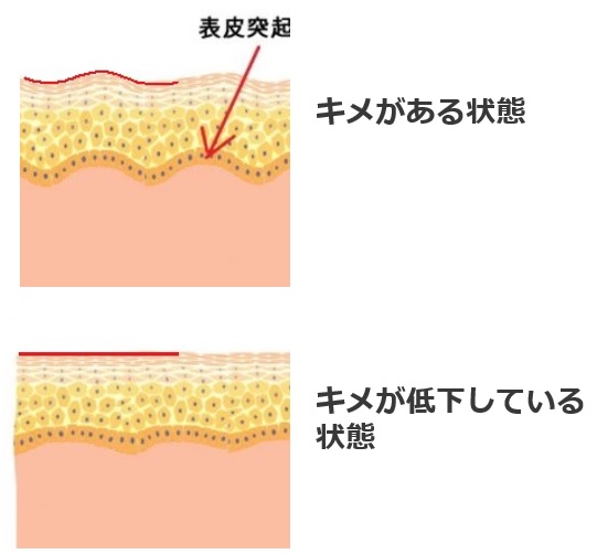 表皮突起は、下の図にあるような表皮と真皮の接着面のことですが、キメがある状態では波打っています。