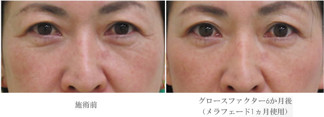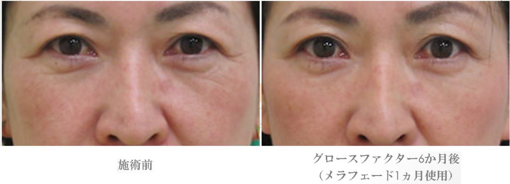 次の方は、脱脂後の方ではありませんが、目の下のシワに対して、グロースファクターの注射治療+メラフェードによる治療を受けられた方です。