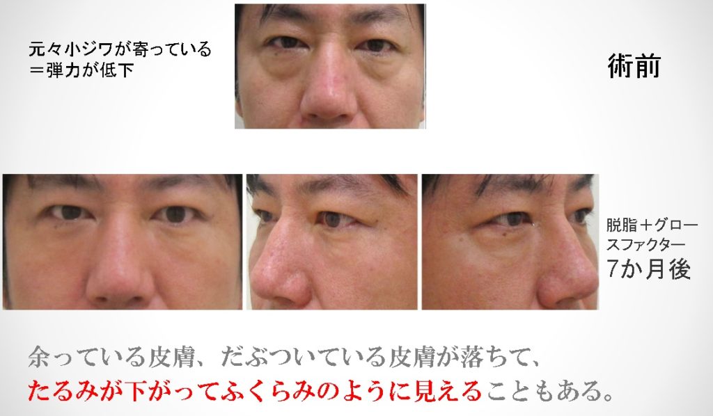 次の方は、目の下に元々シワがおありでしたが、小ジワ・シワのリスクを承知の上、脱脂+グロースファクターを希望されました。